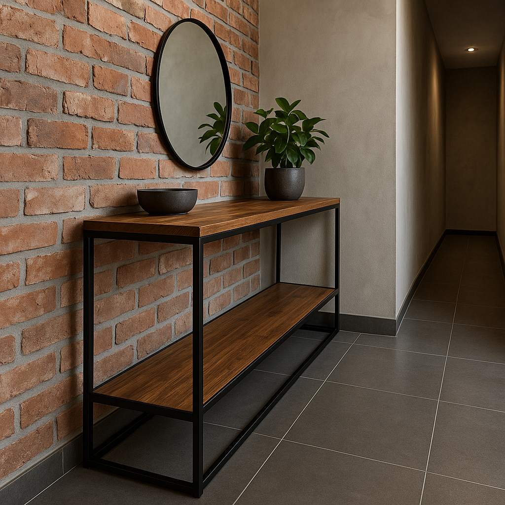 Konsola loftowa nie jest meblem izolowanym – zwykle łączy przedpokój z dalszą częścią mieszkania. Jej konstrukcja musi więc korespondować z innymi elementami industrialnego wystroju. Surowość metalu i ciepło drewna współgrają zarówno z betonem, jak i z ceglanymi akcentami, co wpływa na to, że konsola nie rzuca się w oczy jako obca forma, lecz staje się integralną częścią wnętrza.